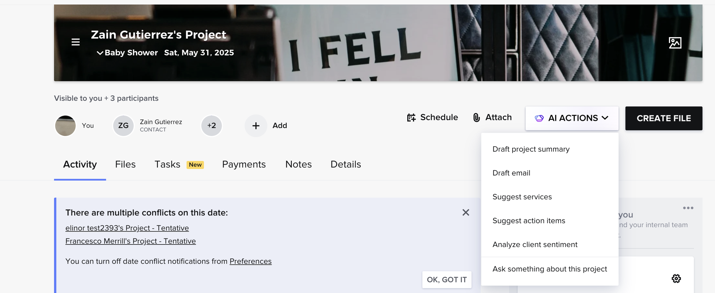Personalization at Scale: The beauty of AI for client management within HoneyBook is that it helps you maintain a personalized feel, even as your business grows. The AI works with your existing client data, allowing for highly relevant suggestions that make your clients feel seen and understood.